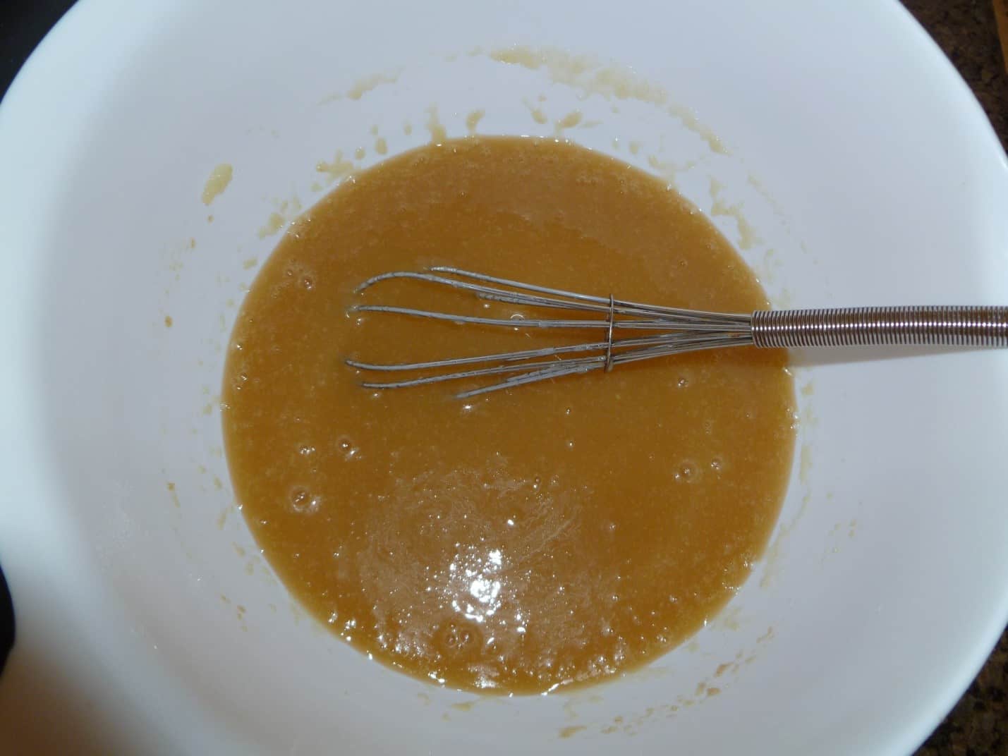 - In a large bowl, whisk the remaining ¾ cup sugar and the oil until combined. Add the eggs, one at a time, whisking well after each addition. Whisk in the applesauce and vanilla.