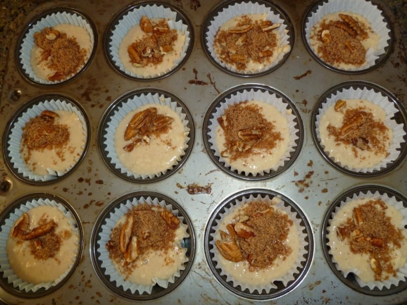 Pour the batter into the prepared muffin pan and sprinkle with the pecan mixture.