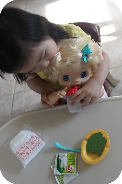 My little one is ultra pleased being “mommy fiona” to her new Baby Alive doll she called “baby sofie”. She sings to her just like I do, she tells her stories from the mini-encyclopedia she loves me to read to her…and so many other things that she can’t do with her previous dolls. Baby Alive makes her feel loved since it can tell her “I love you Mommy!” Mommy Fiona is ecstatic to feel responsible, too. When Baby Alive says “I’m hungry” she right away feeds it with the bowl of special doll food. After meals will be a bottle of water just like her and soon enough it will be time for a change of nappy. It is a routine, but children love routine. And so is very pleased with the feeding, changing and napping. Yes, Baby Alive sleeps and she lets Fiona know that she is sleepy. It instantly wakes up when sat upright for another round of playing and taking care of.