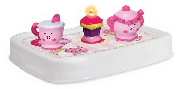 Girls can have tea time all the time with their Play Tray. It features a teapot, a cupcake and a tea cup. It is beautifully done in a playful shade of pink and each of three lights up just as it does on the Safari Tray. The teapot whistles, the cupcake features a candle on top that lights up and the tea cup has a little spoon inside that stirs the tea.