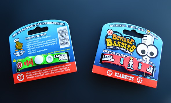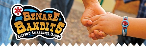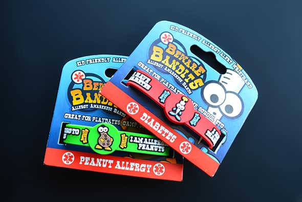 Fast forward to the present, and an exciting new product line has come on the market to address just these sorts of issues! Beware Bandits are a fun and easy to wear medical alert wristband designed specifically for children to identify and promote awareness of their allergies or health conditions. They come in bright colours and while they are clearly designed with children’s tastes and lifestyles in mind, they are also incredibly useful in drawing attention to their medical alert message for caregivers.