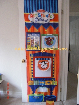 This door easel is so innovative; I couldn’t believe it when I first saw it. It starts with a large swath of cloth that wraps around any standard sized door. On one side of the door, there’s an art easel space. On this side, there’s a magnetic clip to hold paper up, so your child can paint standing up, like a real artist. Underneath, there are several pockets to hold art supplies.