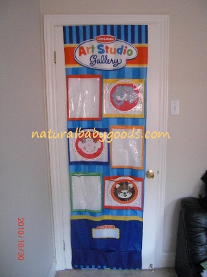 The other side of the door is your child’s own little gallery. The display pockets are sized to hold regular sized paper and are easy to switch art in and out of. This gives your budding artist complete control over which works to display and which to store. No more trying to display everything your child creates: this gives them the control.