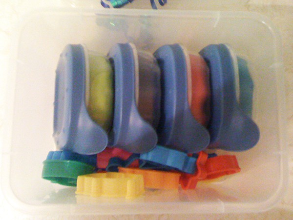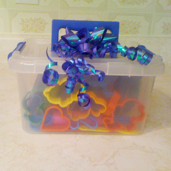 I recently made some for my nephews who are still little, so I used fruit flavors and fun neon colors to make the dough. I then purchased four small food storage containers with nice blue lids to store the dough in. I also picked out a variety of plastic cookie cutters in fun shapes and some small plastic cutting and rolling tools in the kids section. I then packaged it all up in a large translucent toolbox container for them, and they loved their new playdough set!