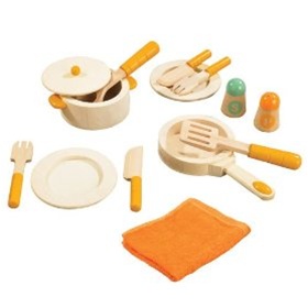 This cooking toy-set fascinates my child in a very girly way. The cookware, dinnerware, and silverware are all made of natural wood with orange water-based paint. It also includes salt & pepper shakers which produce realistic sounds, 2 knives, 2 forks, 1 pot with lid, 1 fry pan, 1 large ladle, 1 spatula, 2 dishes, and a handy kitchen towel.