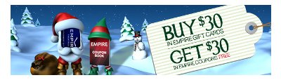 Some exciting gift ideas are personalized tees or a scrapbook. It is just kind of time-demanding but is really one of the all-time perfect gifts. But if you don’t have enough time to do the work, perhaps an Empire Theaters’ Gift Card plus Empire Theaters Coupons will do the trick. I know almost everybody are movie junkies and will never say no for a movie treat. With this gift idea, you will never go wrong. What is really great with the Empire Theaters Gift Cards is that, when you purchase $30 worth in Empire Theaters’ Gift Cards, you will also get $30 of Empire Theaters Coupons. You can keep the coupons for yourself but you can have the better option of bundling it with the gift cards which will give you bunch of incentives such as: