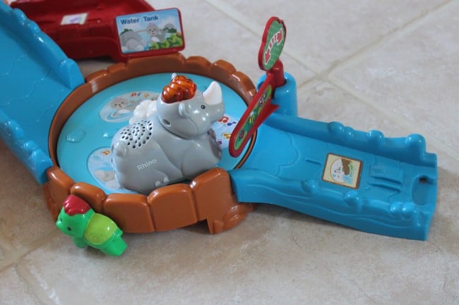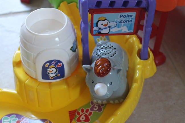 Well, the hero of Go! Go! Smart Animals – Zoo Explorers PlaySet from VTech is one cute rhino that plays music and phrases when children press his light-up button, push him along the track, or ride him over one of the seven Smart Point locations that are dotted around the play set. The toy is set in a zoo that your children themselves can assemble and configure however they want.