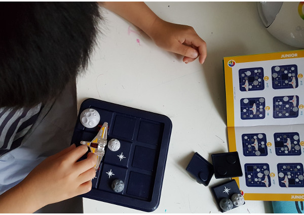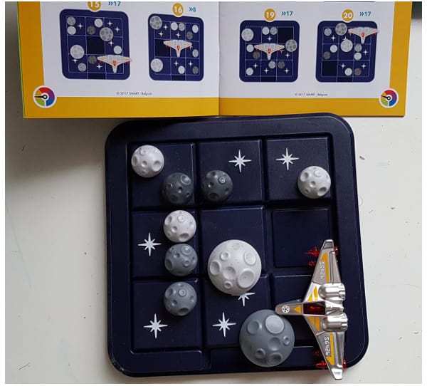 The principle is the same with the “Asteroid Escape” game. The content of this puzzle is slightly different and is primarily designed for the kids who love planet. In addition, the packaging says that it is intended for ages over 8. The gaming board is divided into nine pieces and has 8 figurines on which spaceship and asteroids are located. Challenge booklet is there too.