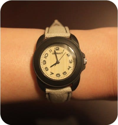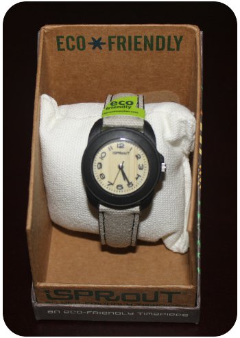 Luckily, I received a Sprout brand watch for review from Groovy Organic Style. I fell in love it right away. The one I got was really great, the strap is made up of organic cotton, the case is made out of corn resin, and all Sprout watches use mercury free batteries, which is another eco-friendly advantage. My favorite part of this watch is the face of the dial. At first glance it looks like a lightly colored wood grain. It’s actually made out of bamboo! All the dials on Sprout watches are made from bamboo, so no two watches are alike! I was also surprised that these watches start out at only $30! I think that’s a reasonable price to pay for a decent watch.