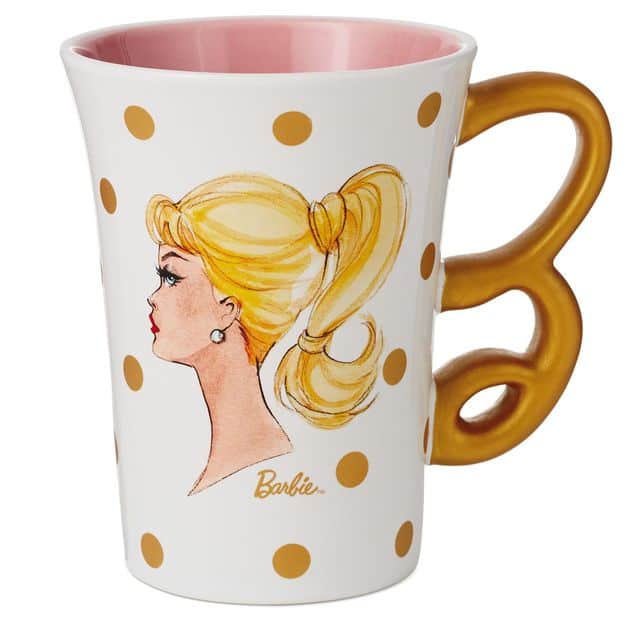 Something about this mug makes me want to drink gourmet coffee with it, not just plain black or creamy. Must be the elegance of it. Tall and slim, with gold polka dots and Barbie’s vintage sketch, and with my favorite feature: the gold iconic B-shaped handle! Definitely Barbie.