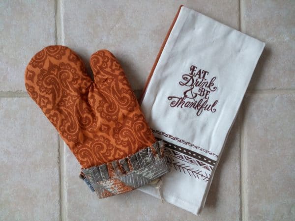 Along with my lovely set of tea towels comes a cheerful Hallmark Autumn Stripe Oven Mitt. It is beautifully colored for autumn and has a quilted, padded lining throughout the inside.