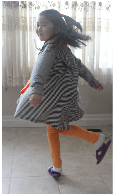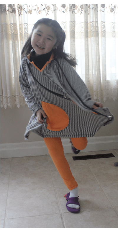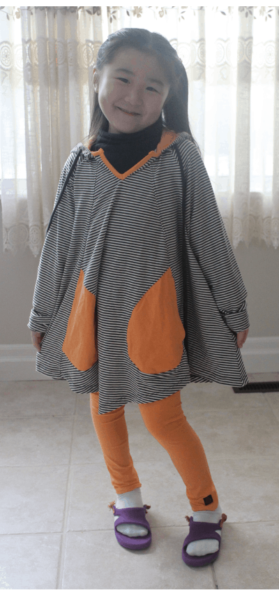 To go with the adorable melon leggings, my daughter usually picks her Dalia tunic hoodie. This tunic hoodie is the cutest thing. It has charcoal and milk colored stripes across it. The inside of the hoodie is lined with a great orange color and there are two pockets on the front in the same orange used to line the hood. It comes down to around her knees, so she’s kept plenty warm. The Dalia Tunic Hoodie is machine washable. It is made from Peruvian Cotton so it’s very comfortable for my daughter to roam around outside in or lounge in the house if she wants. This tunic is great for layering on chilly fall or spring days. It is available in sizes from 2-14 and is currently on sale. The Dalia tunic also comes in a dark grey with grey and red stripes.