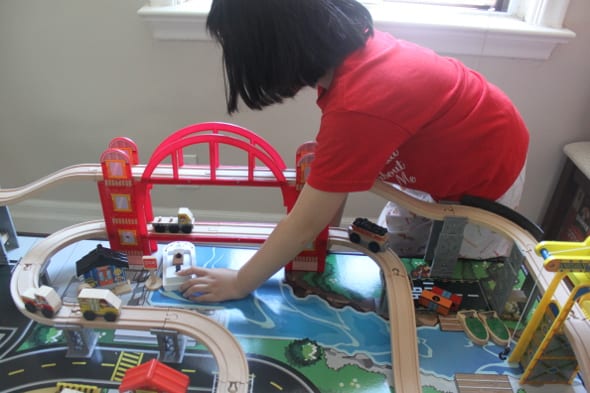 It’s a great toy set for sharing among playmates! And when it comes to bonding for siblings with not-so-small age gaps plus opposite sexes, this train set doesn’t disappoint. It’s obviously for boys, but my daughter likes to involve some of her little dolls and other girl’s toys in the set when it’s her turn to play. My little boy and big girl can play together as my mister toddler stands up while my school age daughter sits down. They both can play in their own comfortable positions.