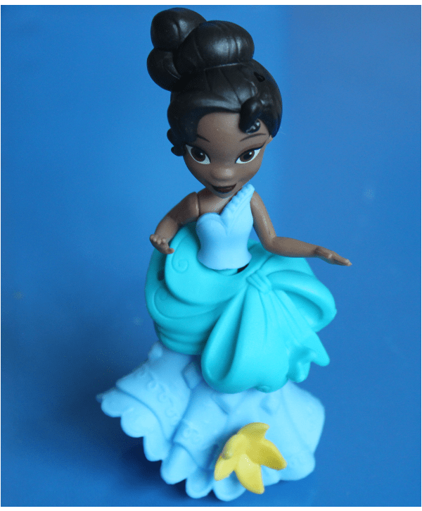 And speaking of a beauty queen wave, this little Tiana doll does it! And she comes with a fabulous change outfit of a blue ball gown. My daughter enjoys mixing and matching her green and blue bodices, skirts, peplums and other snap-ins. And this Little Kingdom Tiana can also sit and stand. I just wish she had a little restaurant set though.