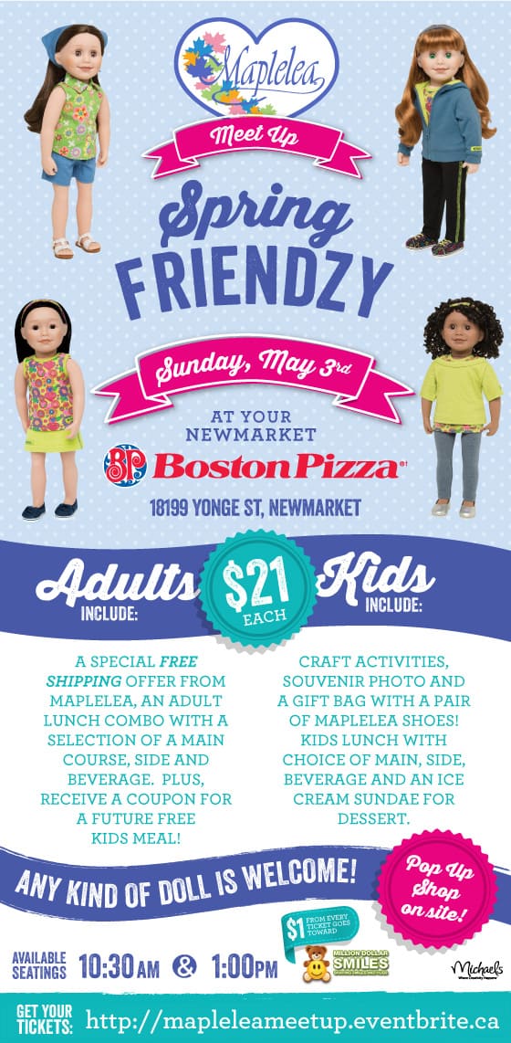 You’re invited to the Maplelea Meet Up Spring Friendzy event, happening Sunday, May 3rd at Boston Pizza in Newmarket!