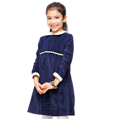 Mommies would surely love the dress too. A navy corduroy, with a silhouette of an A-line cut with two inverted front pleats and 1 inverted back pleat provides comfort for your little girls as she moves around, accentuated with green scallop underneath the peter-pan collar and the cuffs on the ¾ length sleeves with matching rickrack around the bodice, it surely is a lovely sight to behold. The sleeve length can also keep her warm during the cold months. This 85 % cotton and 15 % polyester with a navy lining in bodice area is a good keep for other siblings too.