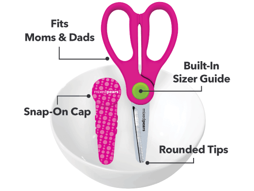 These scissors include a snap-on cap to keep the shears safe and clean. They feature a built-in sizer guide to help us moms cut baby’s food at the recommended bite sizes, and in my case for perfectly cutting my veggie monster’s eyes and mouth right. My favourite feature is the soft food cutting grooves that keep soft food like cheeses and tofu from sticking to the shears.