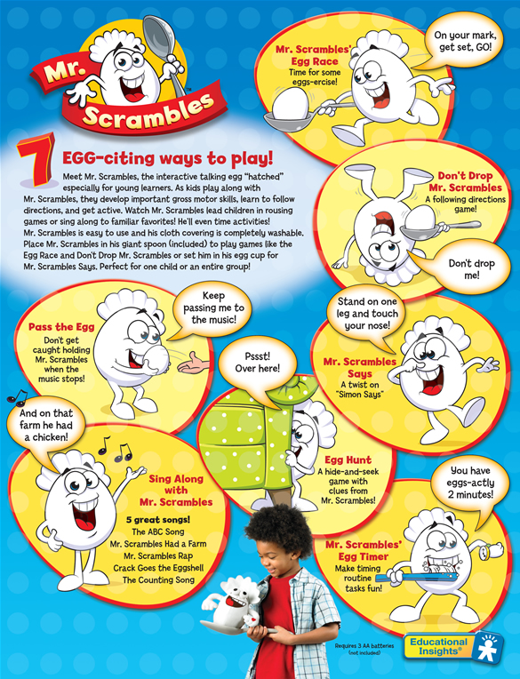 Basically, the are 7 EGG-citing ways to play Mr. Scramble! First, you can Pass the Egg while the music plays and never get caught holding Mr. Scrambles when the music stops because your friends can think of any consequence for that! You and your kids can also sing-a-long with Mr. Scramble’s 5 great songs! If you want more adventure, try doing an egg hunt with your kids, clues are provided to make the hide-and-seek activity more exciting. This is a very nice activity idea for Easter! You can also use Mr. Scramble’s Egg Timer making daily routine tasks more fun. Mr. Scramble’s also made a twist on “Simon Says” by making is Mr. Scramble Says! Play with your kids and try standing with one leg and touch our nose! Go for a Following Directions Game with Mr. Scrambles too together with a Mr. Scramble’s Egg Race! All these are fun and Egg-Citing Mr. Scramble’s Activity. You will never run out of anything to do!