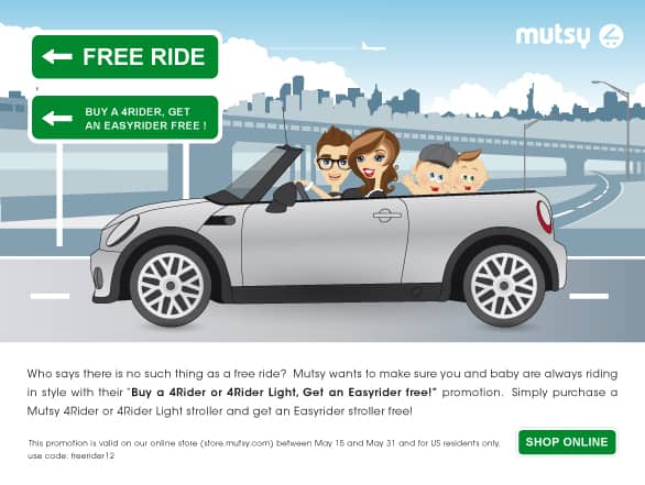 Mutsy announces an AWESOME promotion, buy a Mutsy 4Rider, Get an Easyrider for free. You will find details to share with your readers in the links below and a graphic for you attached as well to share with your readers and make sure to check out the cute animated piece below as well. The promotion will run from May 15 through May 31 and is valid for U.S. residents.