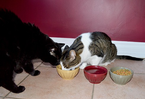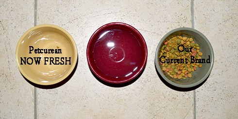 . . . and here is the result of placing two bowls – one of their normal food and one of the new Petcurean food – side by side next to their water bowl for their first taste test: