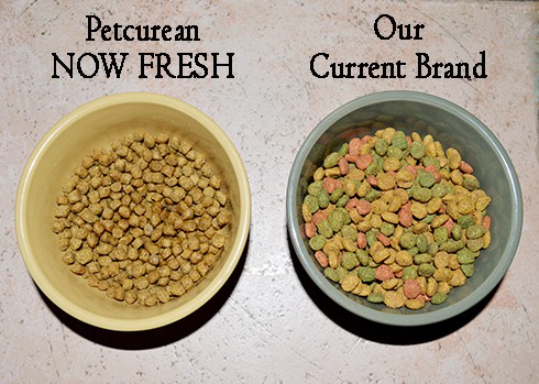Pouring the food out into a dish for them, my first thoughts were that it looked rather bland. Compared side by side with our normal cat food (which is an indoor cat formula and boasts “complete nutrition” and “fewer calories plus extra fiber to help control hairballs” as well as “accents of garden greens”), NOW FRESH looked boring and dry. Of course, thinking further on it, the vibrant colours of our normal cat food were certainly from artificial dyes, and the small, pellet shape of the Petcurean food would obviously be much easier for our senior cats to chew! At that point, I began to feel quite good about introducing my fur-babies to this new food, but I still was uncertain as to what their reaction would be.