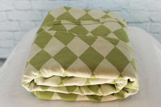 But not Poe Wovens. I personally received a sample wrap from the company a short while ago: their Harlequin Platine. It is a beautiful harlequin pattern made with a durable/ dense weave. A harlequin pattern is a repeating pattern of contrasting diamonds or elongated squares standing on end. A comic, ballet or pantomime character from the Commedia dell’Arte and harlequinade. It arrived just in time for me to put it to the test on one of the hottest days this summer has delivered thus far. I broke it in a bit using the instruction from the company and then, after my son’s nap, I put him on my back in a double rebozo shoulder to shoulder carry and set off for the park.