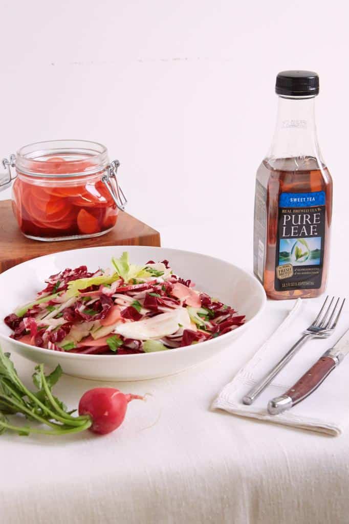 - Instructions: Pour the reserved pickling liquid into a large bowl. Add the honey and whisk to combine. Season with salt and pepper. Slowly add olive oil in a steady stream, whisking constantly to emulsify. Add the fennel, apple, radicchio, celery, parsley and pickled radishes to the bowl and toss all ingredients together to coat. Season with more salt and pepper if desired and garnish with celery leaves before serving.