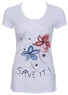 One such tee is their ‘‘Save It’’ women’s shirt, a super cute t-shirt in support of saving our planet. This tee is half organic cotton and half RPET, the silky soft fabric made from recycled plastic bottles. It comes in white with a flattering scoop neck and the front is decorated with colorful flowers and says ‘‘SAVE IT!’’ across the bottom.