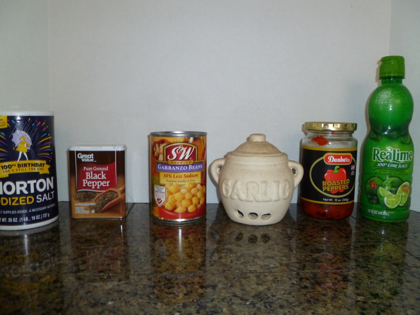 This recipe only needs 7 ingredients and is really fast to make. The ingredients are salt, black pepper, garbanzo beans, garlic, roasted peppers, lime juice, and water. I hadn’t bought roasted peppers before I started using this recipe, so I wasn’t sure what aisle to find them in. I ended up finding them in the aisle with the olives, dressings, and condiments.