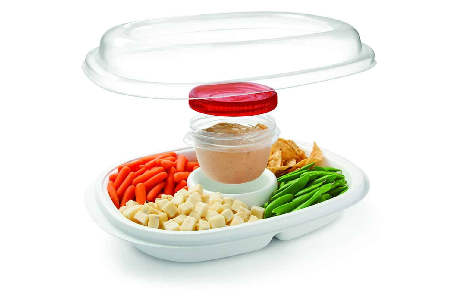 The Rubbermaid Party Platter can hold a great variety of party food because its base dividers make four sections, plus one in the middle for snugly holding its leak-proof inner container with lid for the dip. And of course, the huge platter has its own secure lid too. There are just so many food ideas to make the Party Platter look more festive: colourful veggie slices, cheeses, chips and crackers, or your own hipster finger food combination.