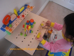 My daughter isn’t the type to build things, so I wasn’t sure if she would be into the Sevi Work Bench. As soon as we got the bench set up though, she surprised me by jumping right in and playing with it. Her favorite tool was the hammer. She loved going around to anything, furniture, floors or even people and “putting them back together”. With time, she really enjoyed the other tools too. She screwed some of the boards together, “sawed” them in half and then mysteriously used a wrench to put everything back together again.