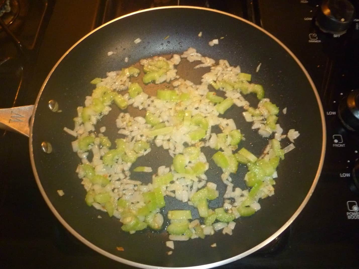 - Warm oil in a small skillet over medium-high heat. Add onion and celery and cook, stirring, until softened, 3 to 5 minutes. Add garlic and saute 1 minute longer. Transfer mixture to a small bowl and let cool.