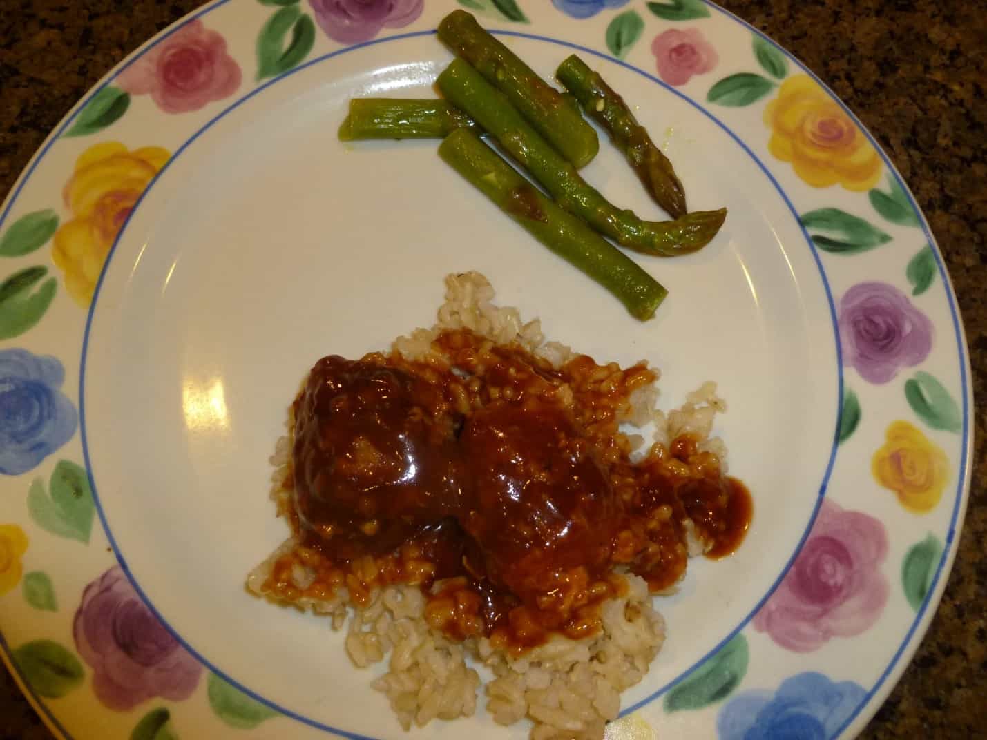 Here are the finished meatballs on top of some brown rice. I also cooked some asparagus. These meatballs are pretty filling – I only needed 2 of them. It was enough to last 2 nights, for our family of 5.