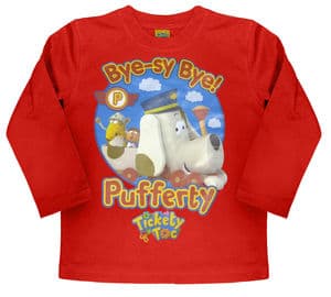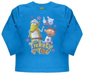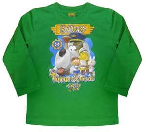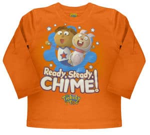 They aslo have the green top which has Pufferty, Tommy, Tallulah and McCoggins (the town maintenance man). This top features the catchphrase “It’s Time to Chime!” A bright orange top is included in this collection and features Tommy and Tallulah. The phrase on this one is “Ready, Steady CHIME!” The vibrant blue top features Tommy, McCoggins and Battersby (who runs the Bell Shop & General Store). This shirt has the Tickety Toc logo at the bottom, as do all other shirts.