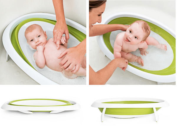 The Boon Naked bathtub is a 2 position collapsible baby bathtub. It kind of reminds me of a pasta strainer, HA. Some of its top features are it can recline, expand, collapse, and be left to drip dry. The 2 positions make this tub perfect for newborns, just recline slightly to be sure your baby is comfortable, and if you are using the tub for a toddler or an older baby it can expand all the way so your baby can sit up comfortably. When you are done with bath time fold it up and let dry until the next time.