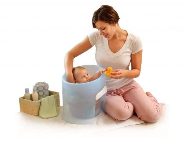 The Original Tummy Tub is a similar simpler version to the washPOD I talked about above. The Tummy Tub allows your baby to bathe in the fetal position and can ease colic and help your baby get a restful night’s sleep. The upright style keeps your baby covered in water and keeps the water warmer longer. An amazing fact is that this tub can be used for children up to 35 pounds that are around 3 years old in many children. Many children learn to love water using this style tub, it helps to eliminate that fear many children have at a young age. The Tummy Tub is easy to store or take with you on a trip. The clear, transparent material allows you to be able to see your baby from any angle. An added feature the Tummy Tub offers that I haven’t seen with other companies is an optional, sold separately two step stool. This allows you to wash your baby from a seated position. It could also be used as a step stool when your baby gets older, or a storage bin.