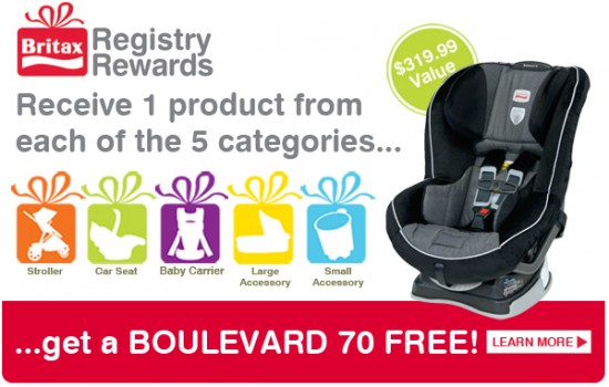 Britax Rewards Registry Program: Right now Britax is putting on a great program where you buy or receive 1 product from each of the 5 categories: Stroller, Car Seat, Baby Carrier, Large Accessory, & Small Accessory and you will get a FREE Boulevard 70 Car Seat! (a $319 Value). Plus if you win any of the great prizes from the Expect Greatness website you can also use those towards the reward!