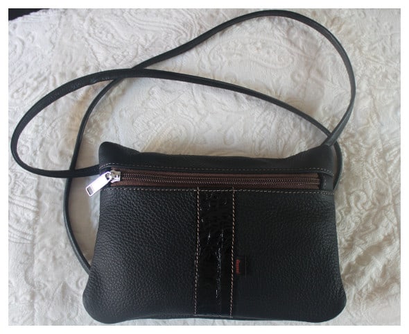 This leather shoulder bag can be worn on one shoulder or cross body as the strap is adjustable; I found that it works well worn either way. It comes in two colors: the always in demand black and a dark, almost brick red which would make for an excellent statement piece. The two pockets made it easy for me to organize everything I needed to carry with me.