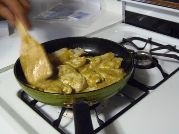 Let oil get hot over med heat and cook sauce (you just prepared)and chicken until done.